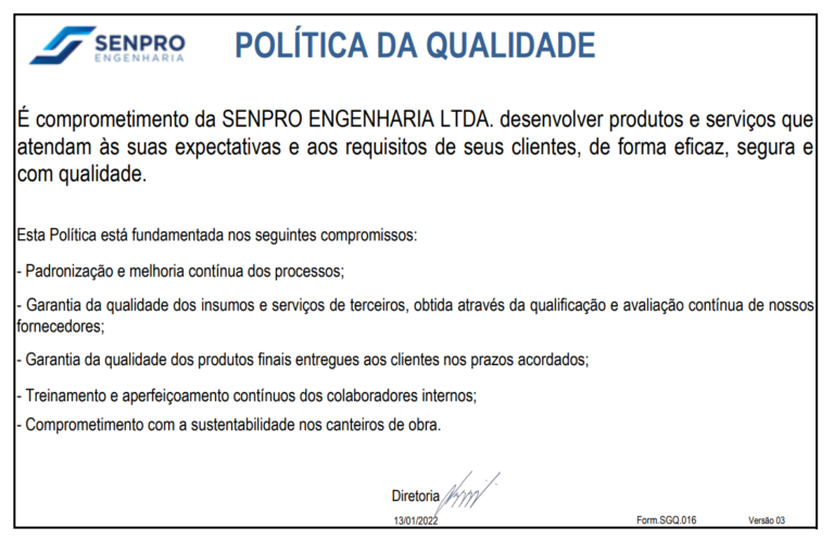 Atenta ao mercado em que atua, a empresa está focada nos padrões mundiais de qualidade para executar seus serviços e processos de trabalho. Ao longo dos anos, investiu em tecnologia, capital humano e fortaleceu sua visão voltada para a qualidade com as certificações ABNT NBR ISO 9001 e PBQP-H – Siac Nível A, um importante passo na busca da excelência em serviços de construção.